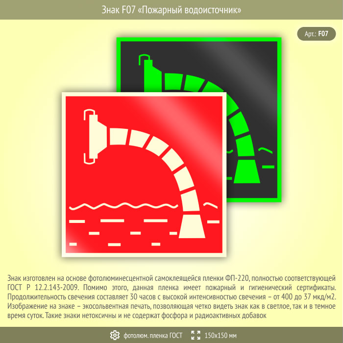 Знак F07 «Пожарный водоисточник» (фотолюминесцентная пленка ГОСТ 34428-2018, 150х150 мм) в Великом Новгороде купить