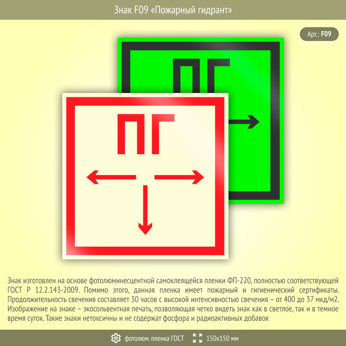 Знак F09 «Пожарный гидрант» (фотолюминесцентная пленка ГОСТ 34428-2018, 150х150 мм) в Великом Новгороде купить