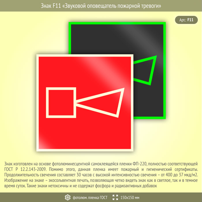 Знак F11 «Звуковой оповещатель пожарной тревоги» (фотолюминесцентная пленка ГОСТ 34428-2018, 150х150 мм) в Великом Новгороде купить