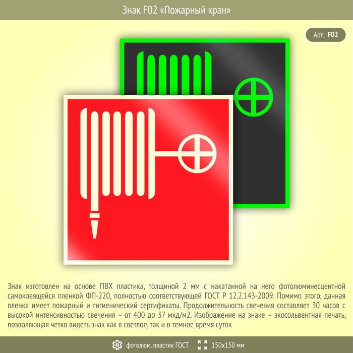 Знак F02 «Пожарный кран» (фотолюминесцентный пластик ГОСТ 34428-2018, 150х150 мм) в Великом Новгороде купить
