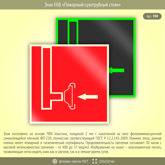Знак F08 «Пожарный сухотрубный стояк» (фотолюминесцентный пластик ГОСТ 34428-2018, 150х150 мм) в Великом Новгороде купить
