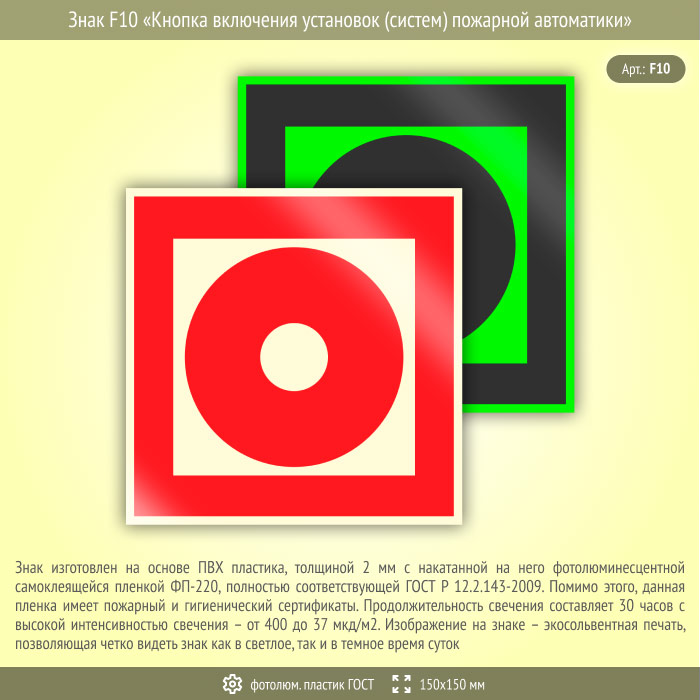 Знак F10 «Кнопка включения установок (систем) пожарной автоматики» (фотолюминесцентный пластик ГОСТ 34428-2018, 150х150 мм) в Великом Новгороде купить