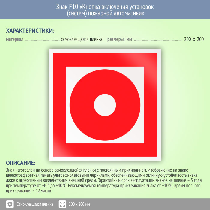 Знак F10 «Кнопка включения установок (систем) пожарной автоматики» (пленка, 200х200 мм) в Великом Новгороде купить