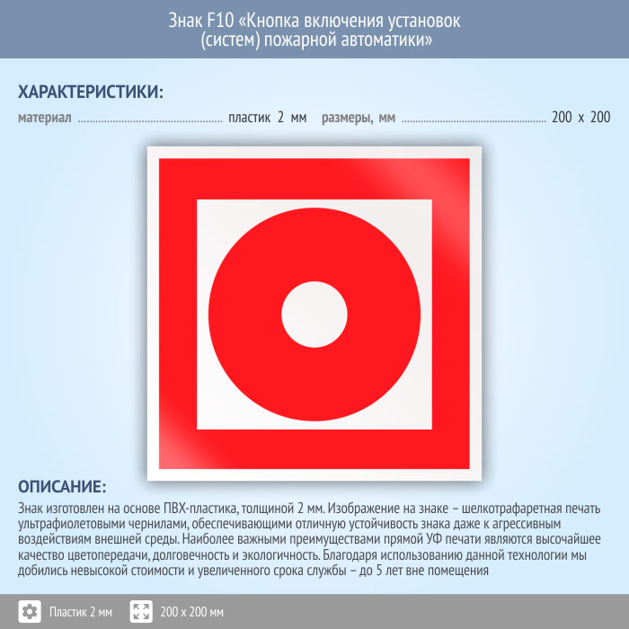 Знак F10 «Кнопка включения установок (систем) пожарной автоматики» (пластик, 200х200 мм) в Великом Новгороде купить