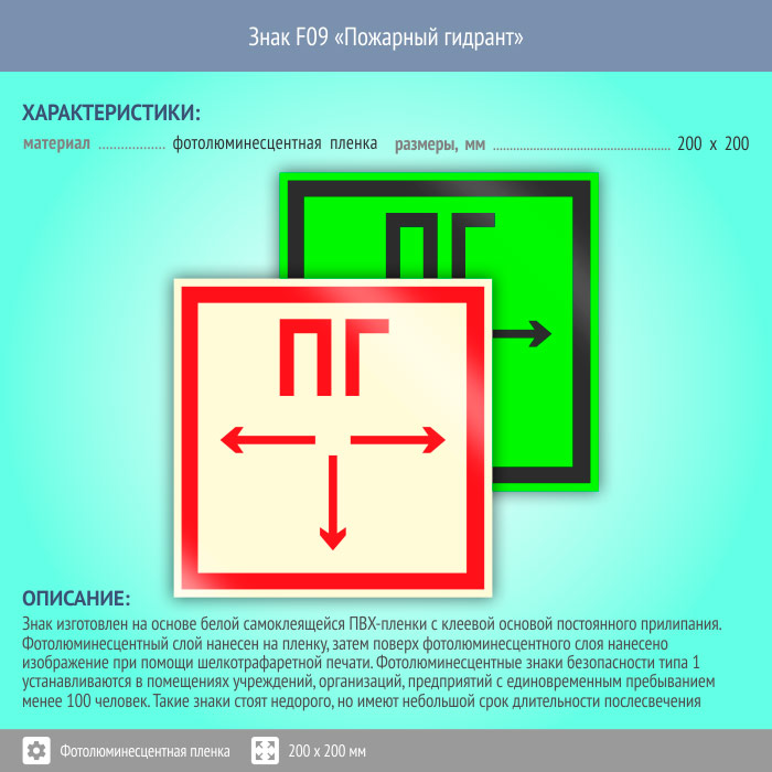Знак F09 «Пожарный гидрант» (фотолюминесцентная пленка, 200х200 мм) в Великом Новгороде купить