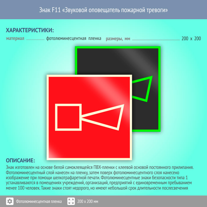 Знак F11 «Звуковой оповещатель пожарной тревоги» (фотолюминесцентная пленка, 200х200 мм) в Великом Новгороде купить