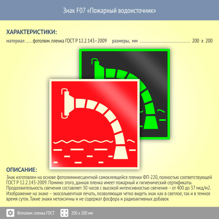 Знак F07 «Пожарный водоисточник» (фотолюминесцентная пленка ГОСТ 34428-2018, 200х200 мм) в Великом Новгороде купить