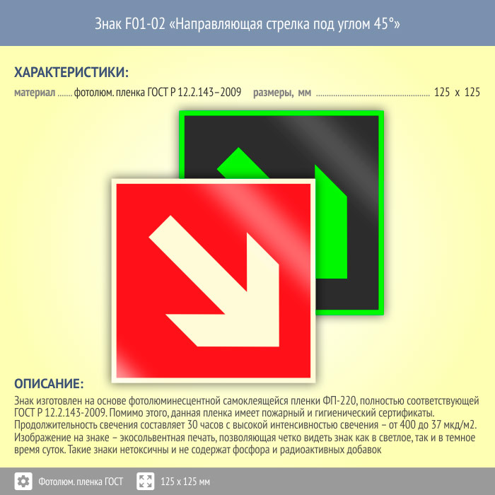 Знак F01-02 «Направляющая стрелка под углом 45°» (фотолюминесцентная пленка ГОСТ 34428-2018, 125х125 мм) в Великом Новгороде купить