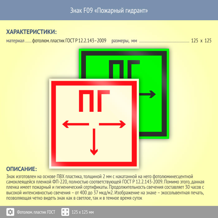Знак F09 «Пожарный гидрант» (фотолюминесцентный пластик ГОСТ 34428-2018, 125х125 мм) в Великом Новгороде купить