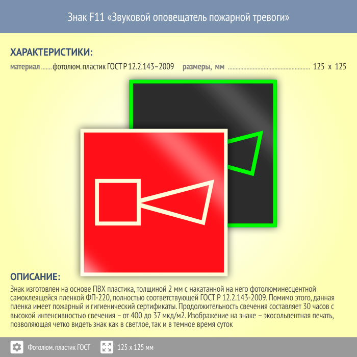 Знак F11 «Звуковой оповещатель пожарной тревоги» (фотолюминесцентный пластик ГОСТ 34428-2018, 125х125 мм) в Великом Новгороде купить